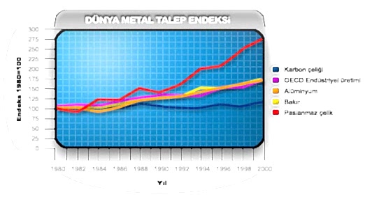 | � | Paslanmaz �elik Paslanmaz �elikler, bile�imlerinde en az %11 krom i�eren bir �elik ailesidir. Bu �eliklerin y�ksek korozyon dayan�m�n� sa�layan as�l unsur; y�zeye kuvvetle tutunmu�, yo�un, s�nek, �ok ince ve saydam bir oksit tabakas�n�n varl���d�r. �ok ince olan bu amorf tabaka sayesinde paslanmaz �elikler, kimyasal reaksiyonlarda pasif davranarak korozyona kar�� dayan�m kazan�rlar. S�z konusu oksit tabakas�, oksijen bulunan ortamlarda olu�ur ve d�� etkilerle (kesme, a��nma, tala�l� imalat, vb.) bozulsa dahi kendini onararak eski �zelli�ine tekrar kavu�ur. Genel olarak paslanmaz �elikler be� ana grupta toplanmaktad�r : - Ferritik, - Martenzitik, - Ostenitik, - Ferritik-Ostenitik (Dubleks), - ��keltme sertle�mesi uygulanabilen ala��mlar. Bu gruplar�n en yayg�n olarak kullan�lanlar� ��phesiz ostenitik ve ferritik paslanmaz �eliklerdir. Ferritik paslanmaz �elikler d���k karbonlu olup %12-18 krom i�erirken ostenitik paslanmaz �elikler temel olarak %18 krom ve %8 nikel i�erirler. Ferritik paslanmaz �elikler ala��m�nda nikel i�ermedi�inden m�knat�slanabilir. Toplam paslanmaz �elik �retiminin kompozisyonu incelendi�inde, ostenitik paslanmaz �eliklerin �retimde %70 ile en �ok kullan�lan paslanmaz �elik oldu�u g�r�lmektedir. A�a��daki grafikte de g�r�lece�i gibi paslanmaz �eliklere olan talep, �zellikle son 20 y�lda di�er malzemelere g�re daha fazla geli�me g�stermi�tir.
